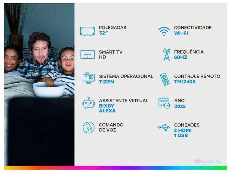Qualidade de Imagem: Painel Crystal UHD 4K com resolução de 3840x2160, processador Crystal 4K e taxa de atualização de 60Hz Sistema Smart: Plataforma Tizen com Bixby e compatibilidade com Alexa integrados Conectividade: 3 HDMI, 1 USB-A, Wi-Fi, Bluetooth e Ethernet para conexão versátil Design e Instalação: Design elegante para ambientes internos